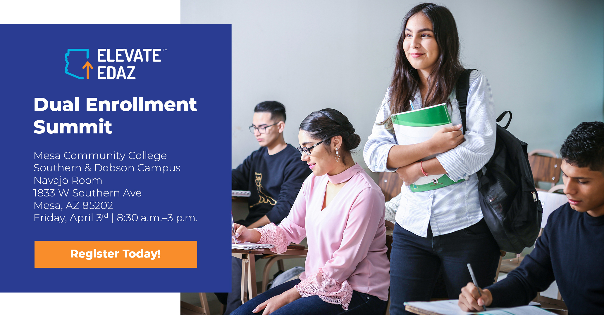 Join us for the ElevateEdAZ Dual Enrollment Summit at Mesa Community College for an engaging day focused on advancing early college credit success. Connect with key stakeholders, explore Arizona’s latest data, and learn best practices.